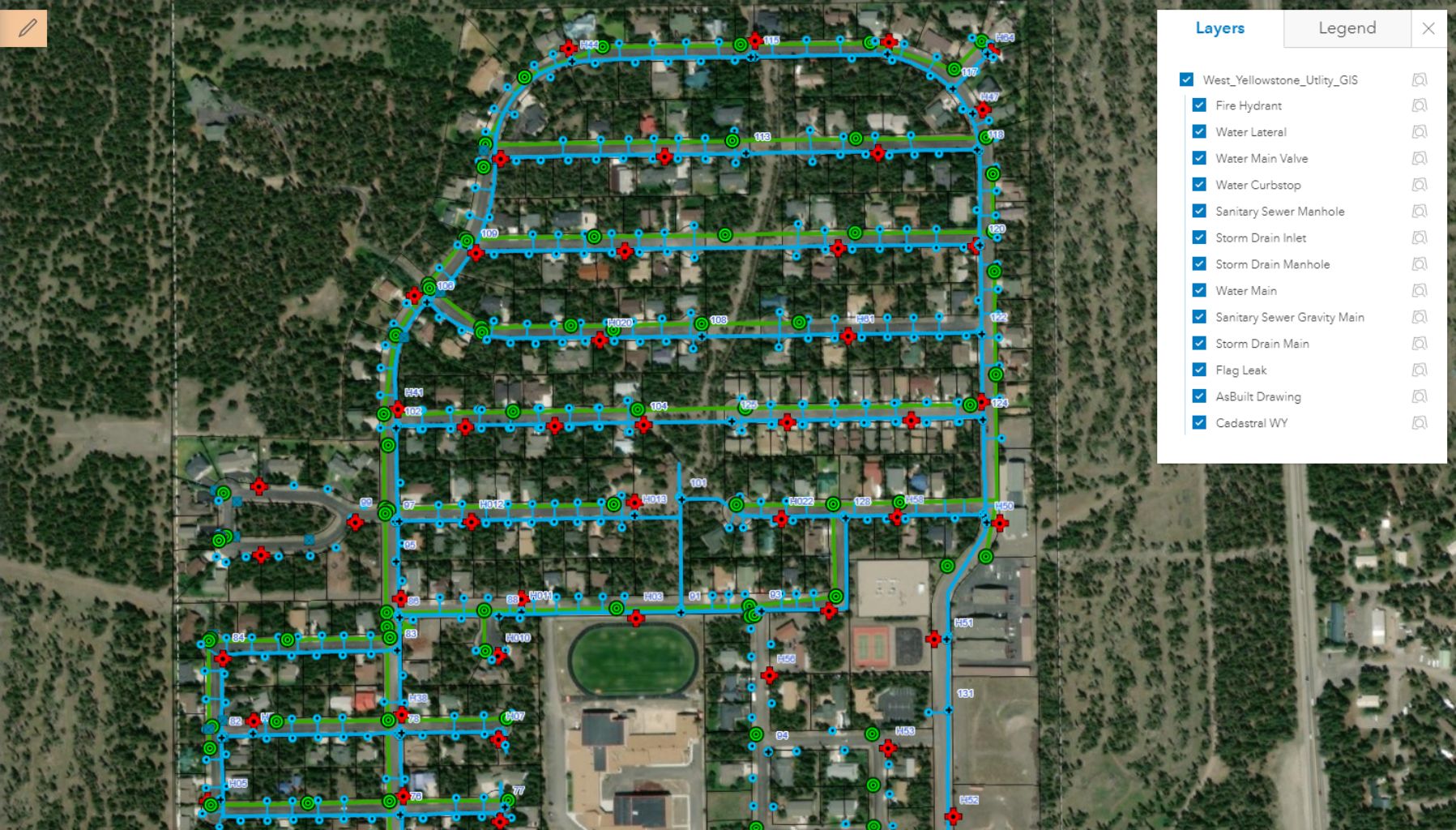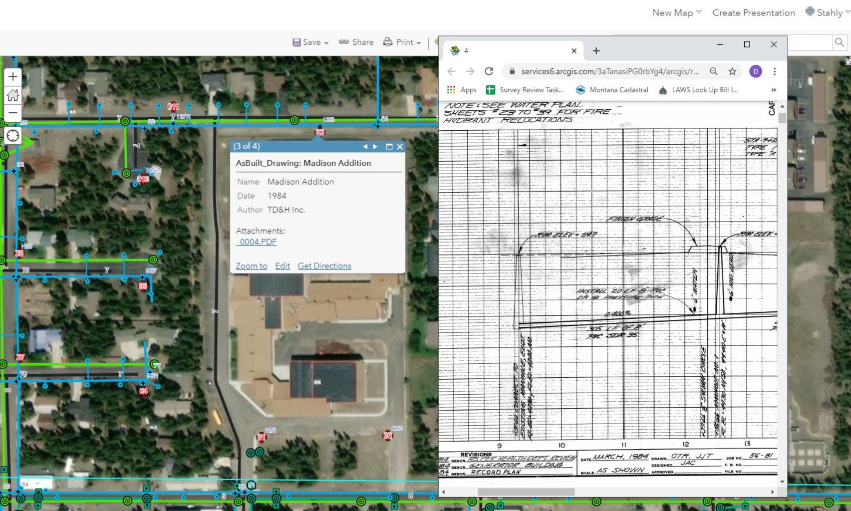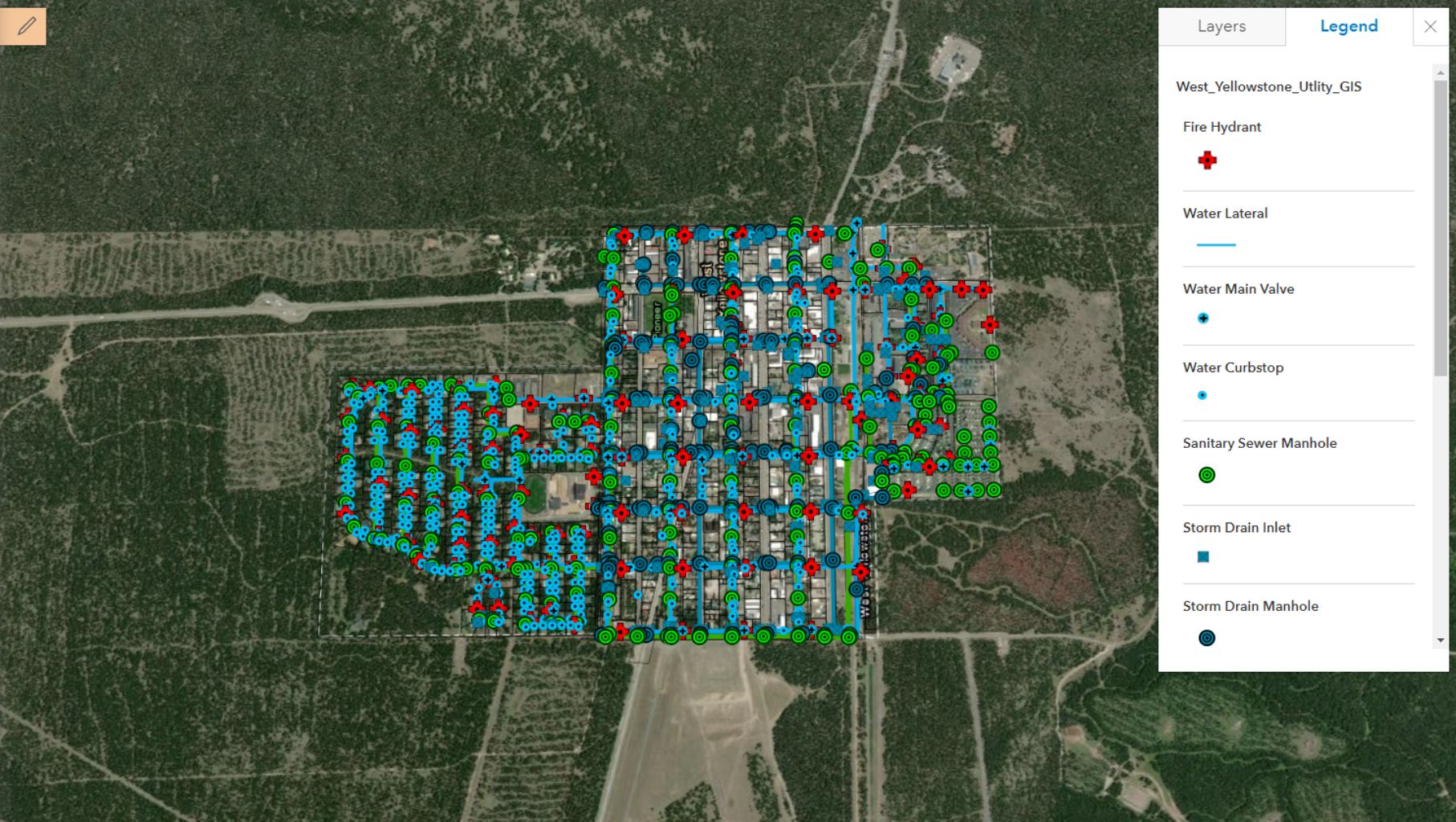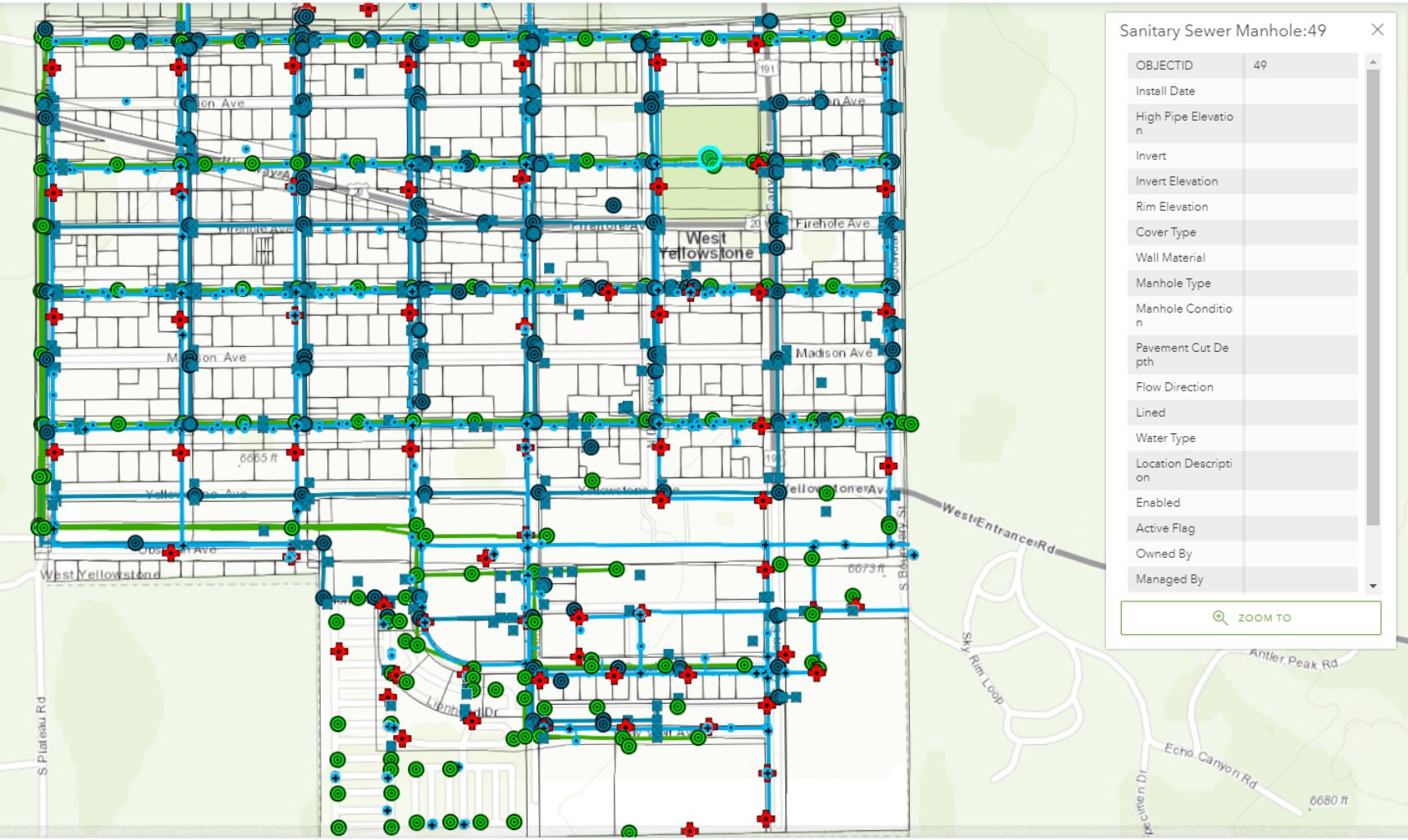 Stahly Engineering developed a master database, along with a working map for the Town of West Yellowstone. Each point or line in the map included attribute fields such as material, maintenance records, coordinates, and photos. The features and associated attributes were customized to fit West Yellowstone and included anything that was helpful for both field and office staff.